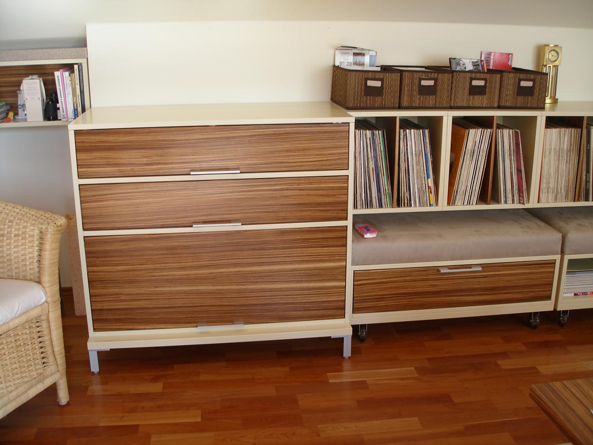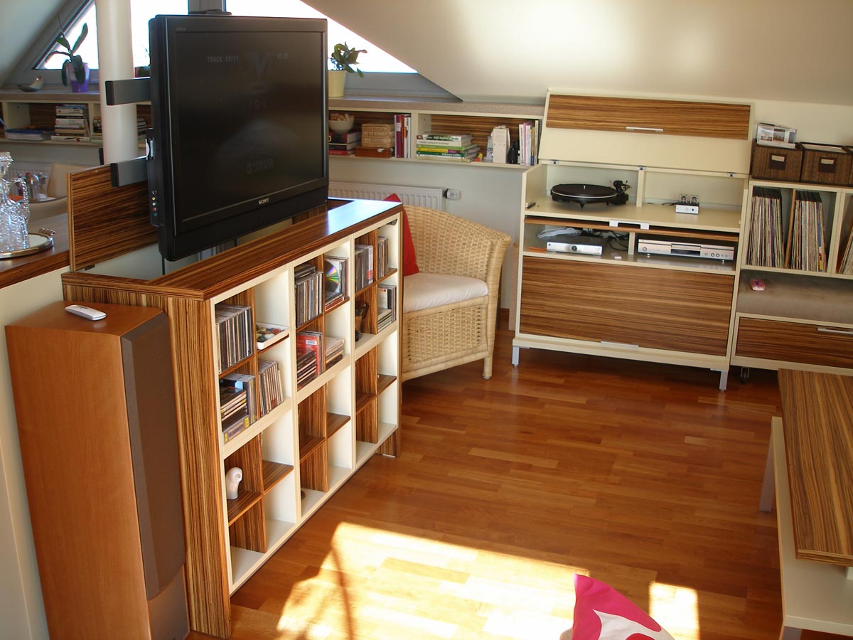 Kuchyně a obytný prostor v půdním bytě. Kuchyně s polohovacím barovým pultem. Obytný prostor s integrovanou AudioVideo technikou. 2008