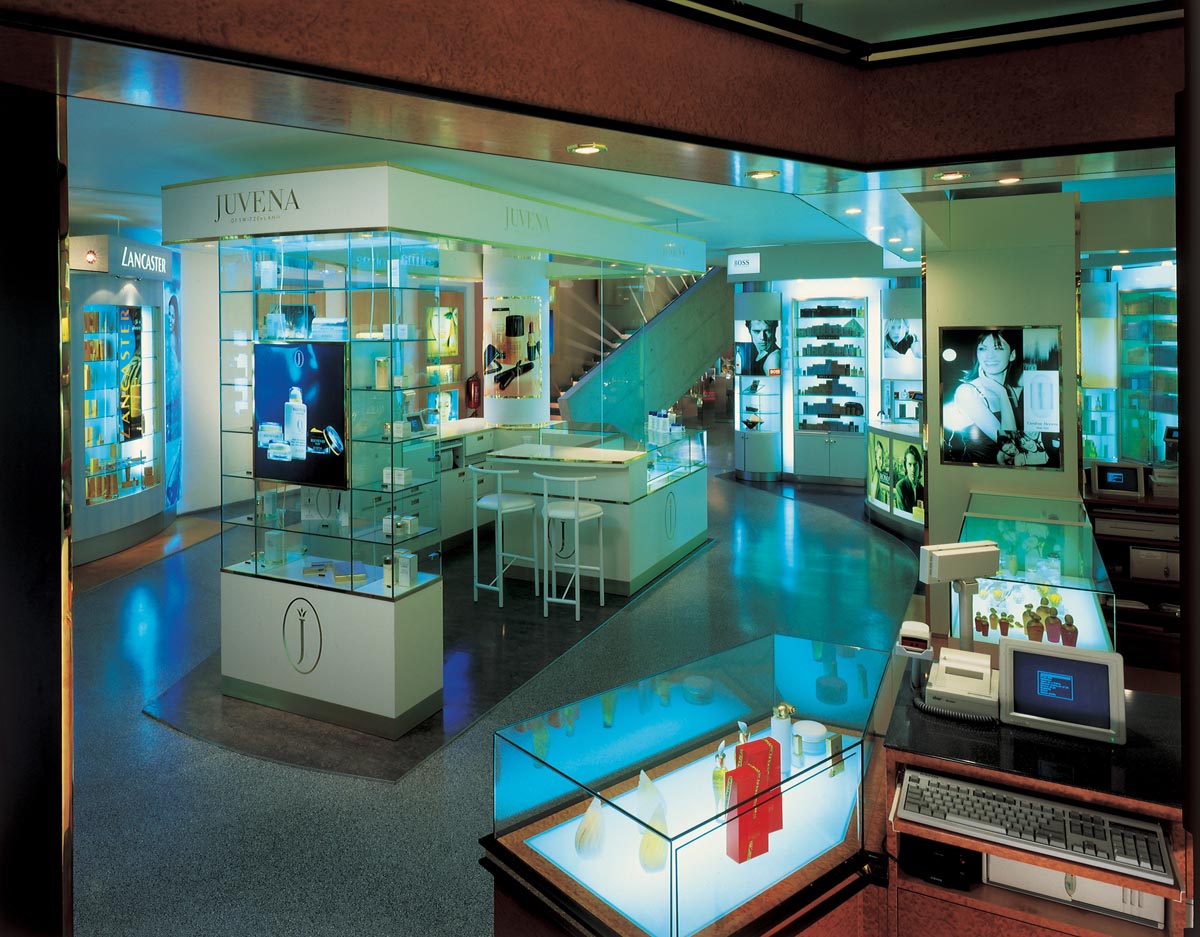 Návrh prodejních koutů respektujícíh Corporate image a Brand image jednotlivých kosmetických značek: Bvlgari, Salvatore Ferragamo, Juvena, Givenchy, Nina Rici, Chanel, La Praire a další. Realizace: Atelier S, Drkoš Interiéry, 1999