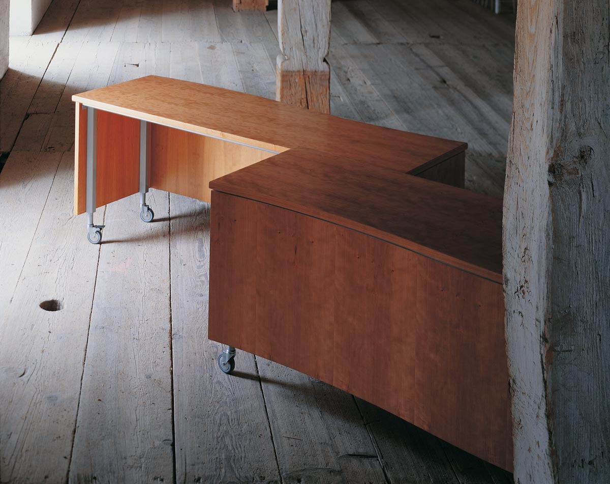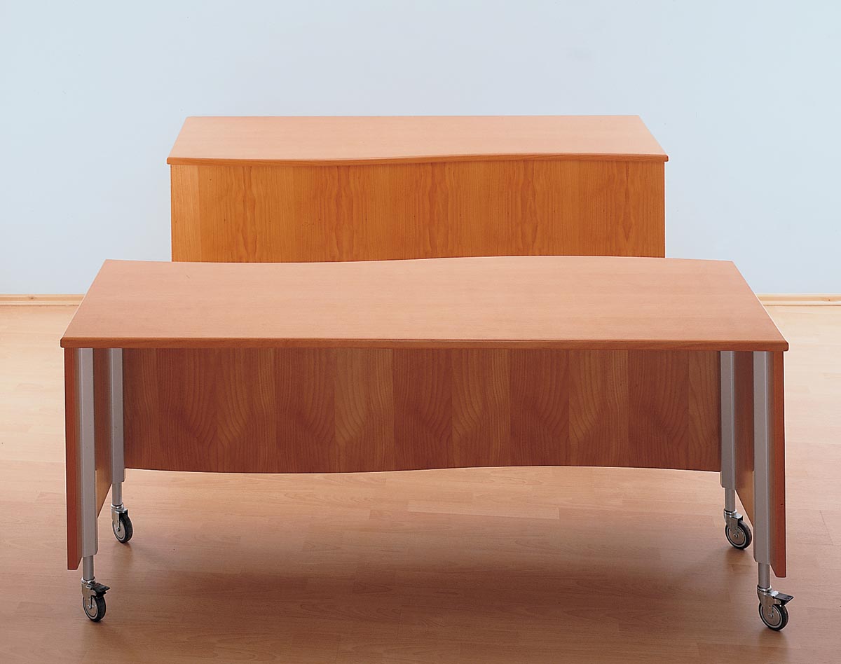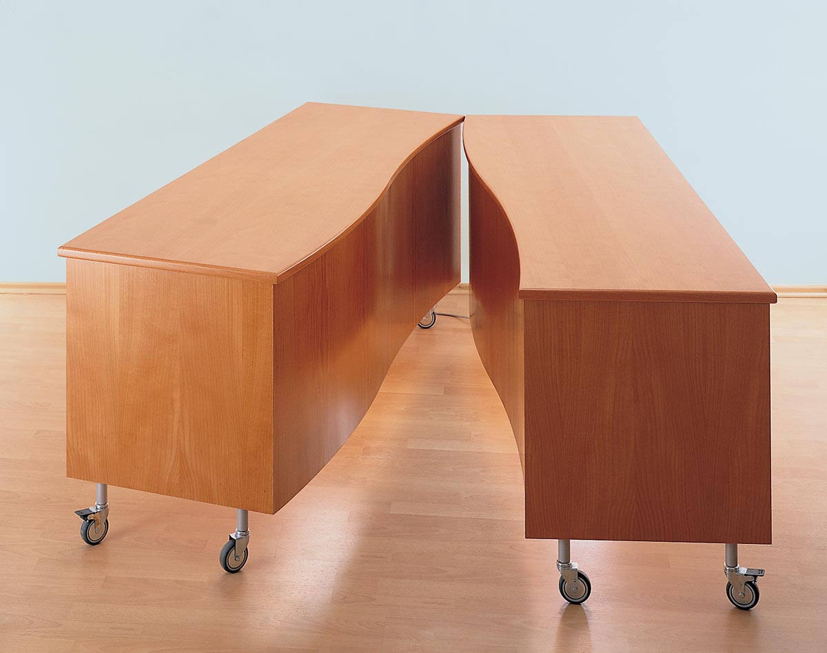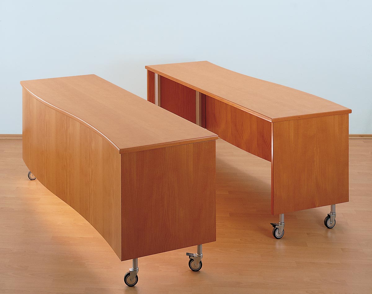 Víceúčelové mobilní stoly. Součást návrhy interiéru zasedací místnosti MÚ Boskovice. Výroba COTTO Lysice, 1996