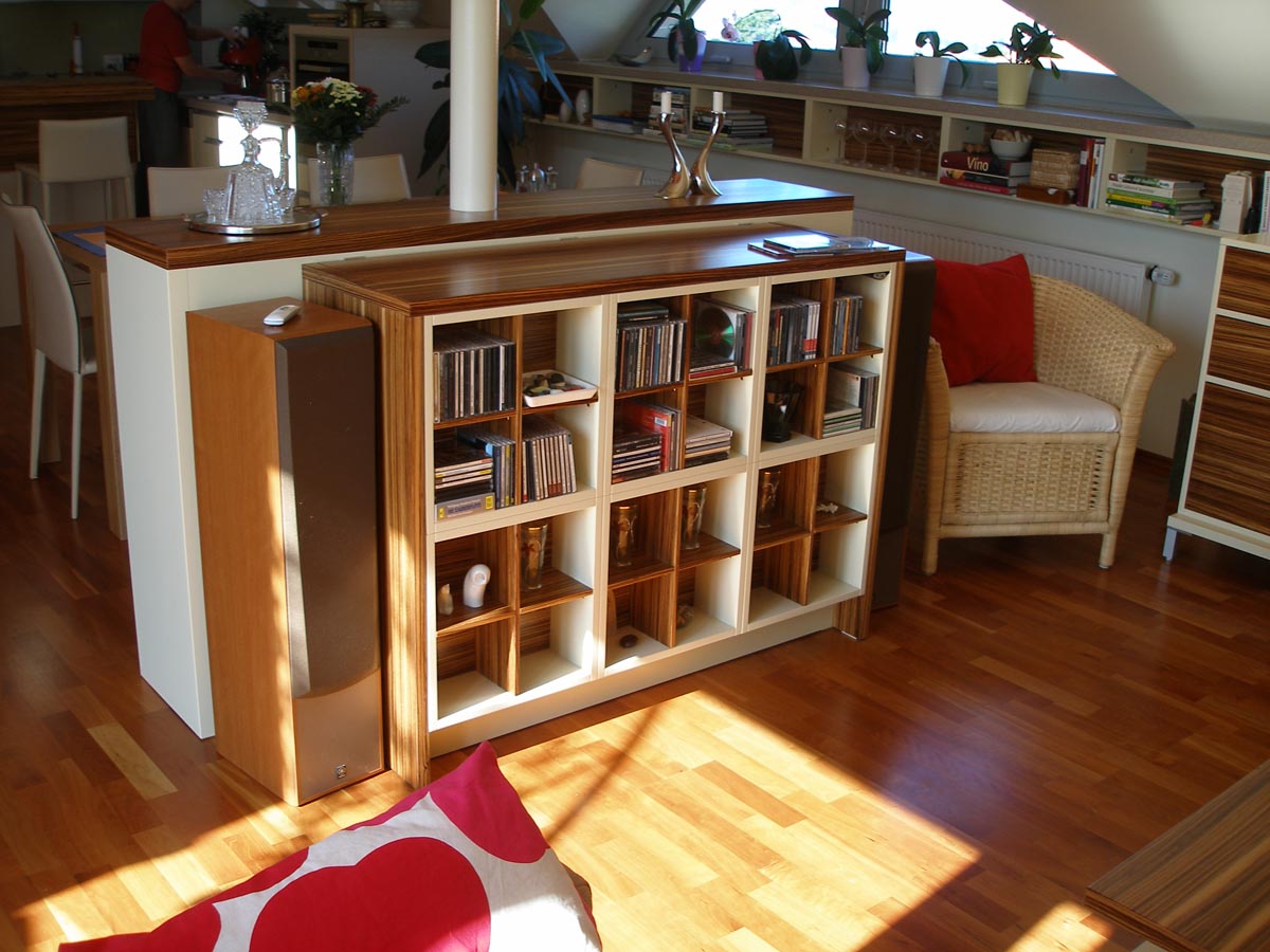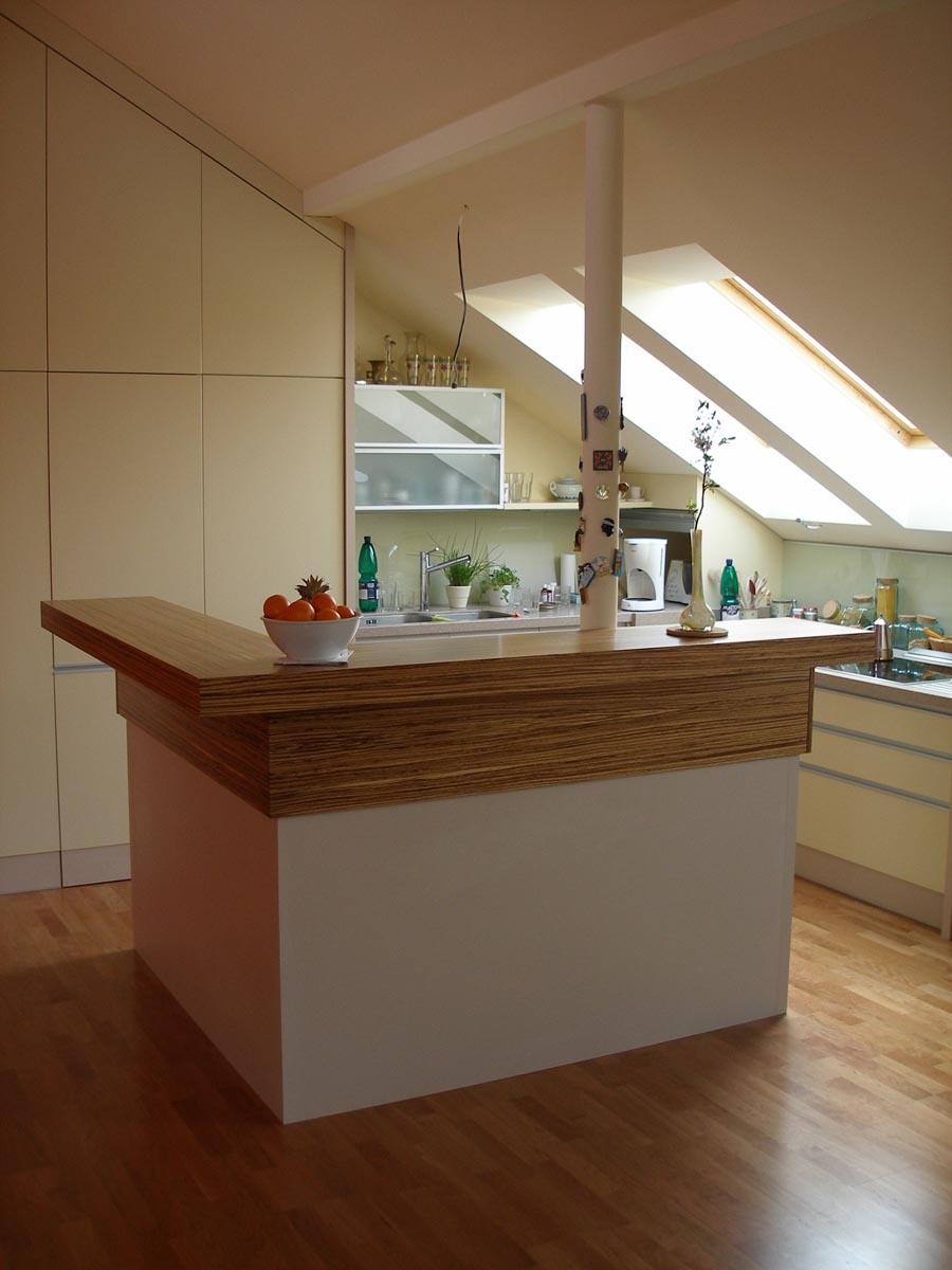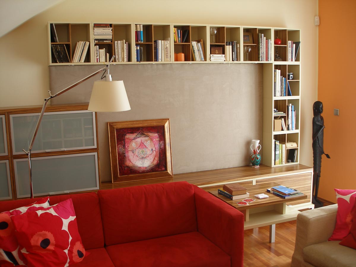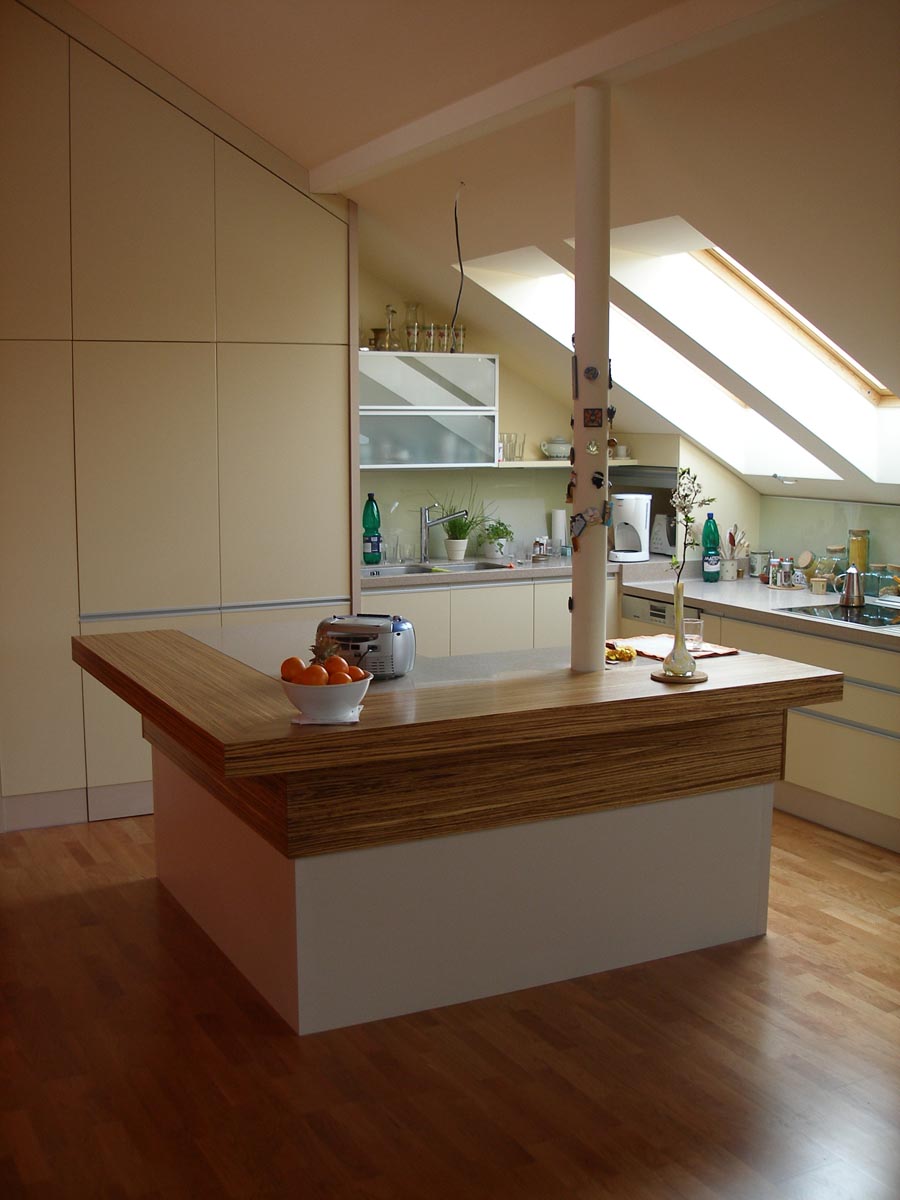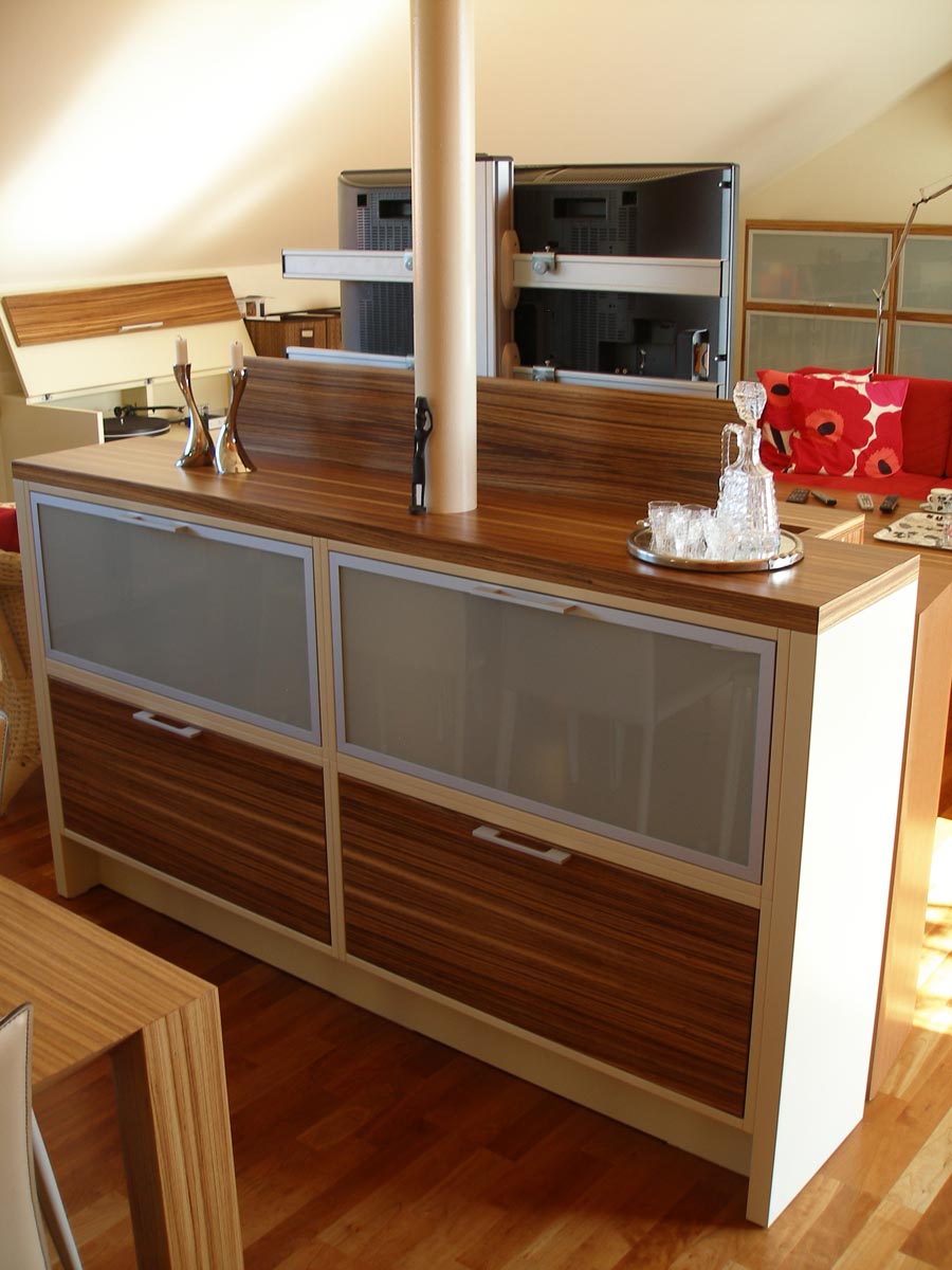 Kuchyně a obytný prostor v půdním bytě. Kuchyně s polohovacím barovým pultem. Obytný prostor s integrovanou AudioVideo technikou. 2008