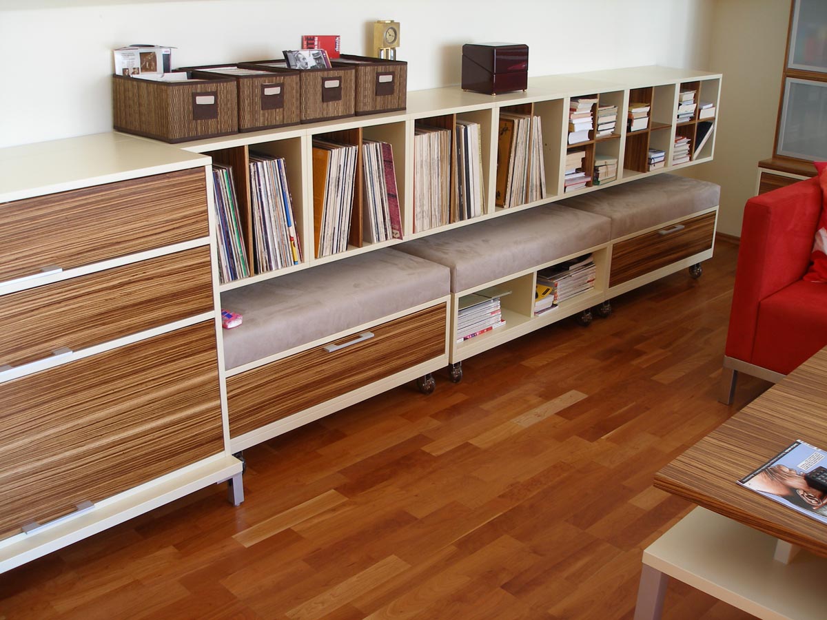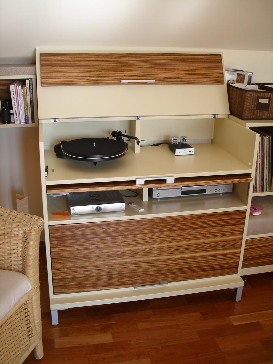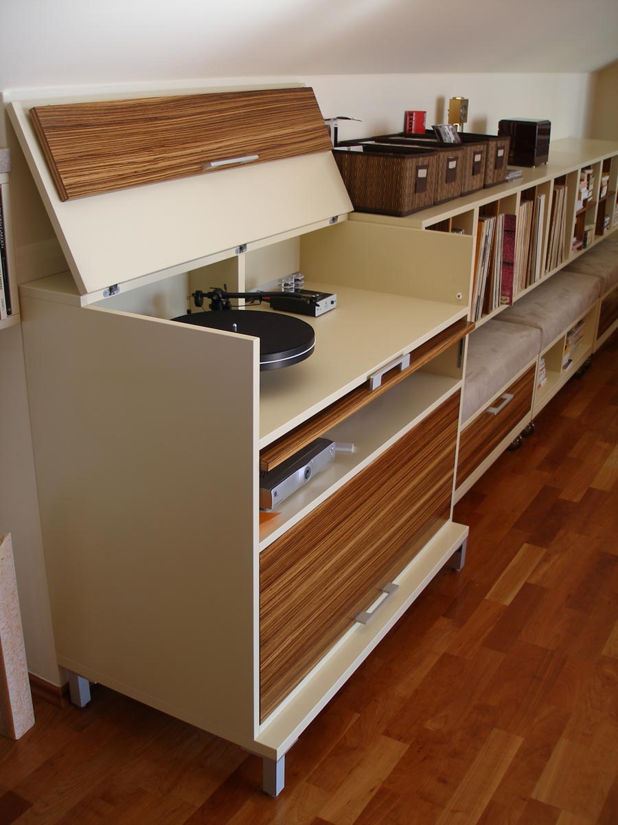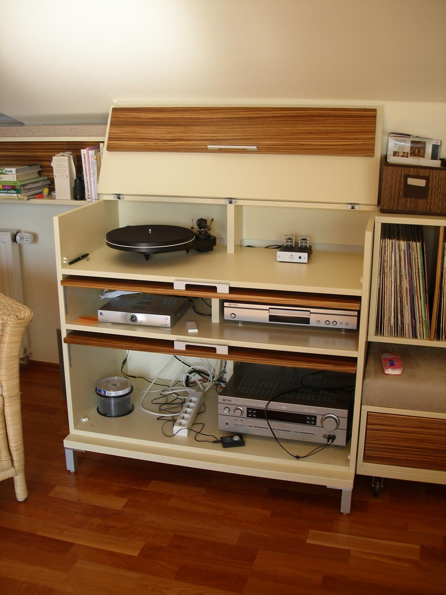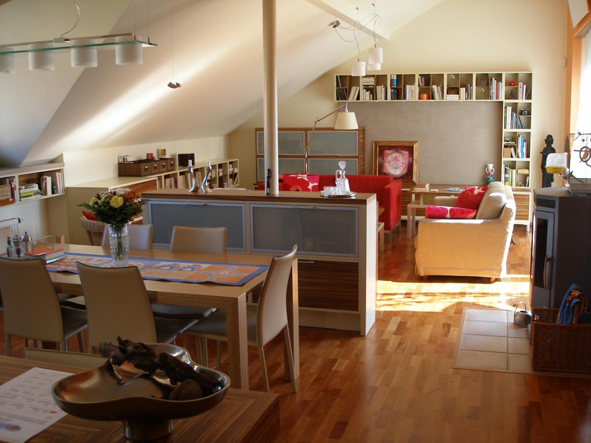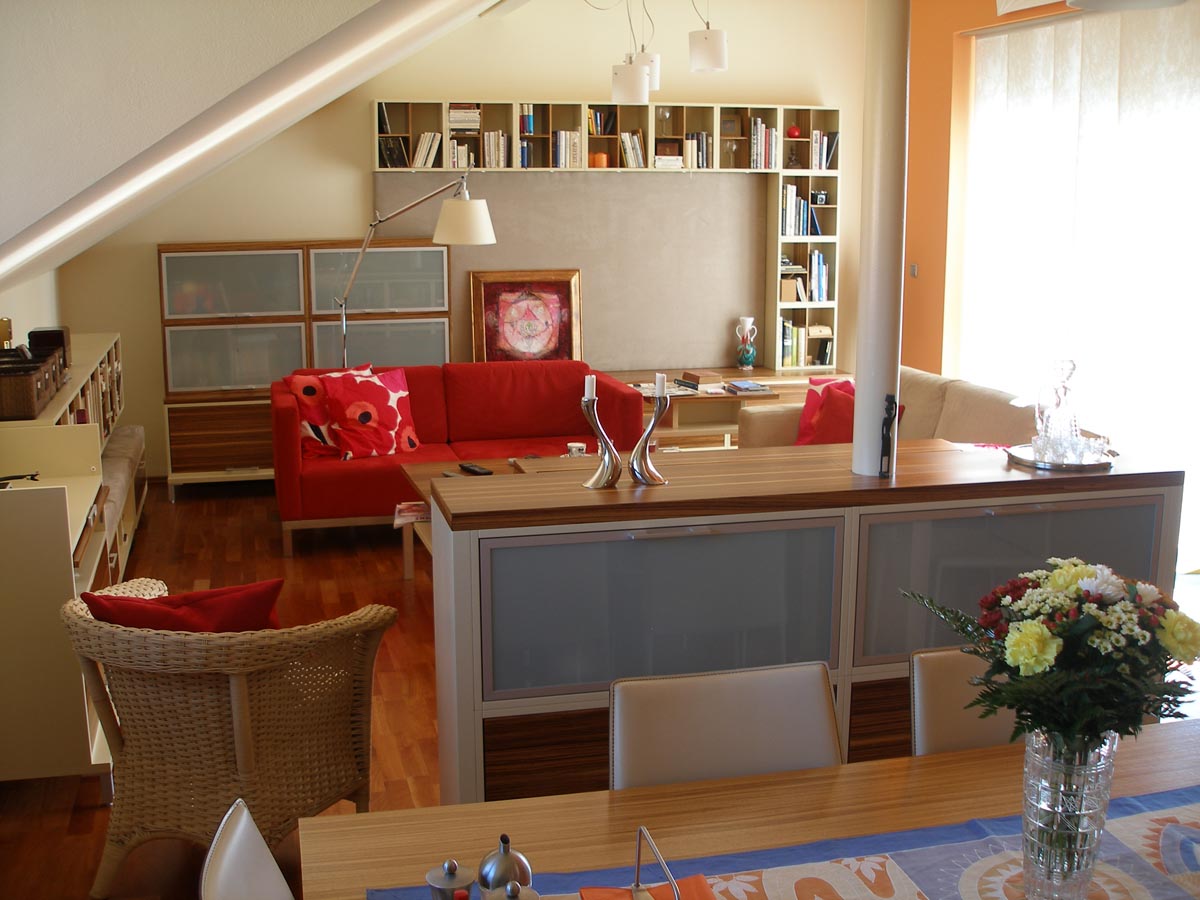 Kuchyně a obytný prostor v půdním bytě. Kuchyně s polohovacím barovým pultem. Obytný prostor s integrovanou AudioVideo technikou. 2008