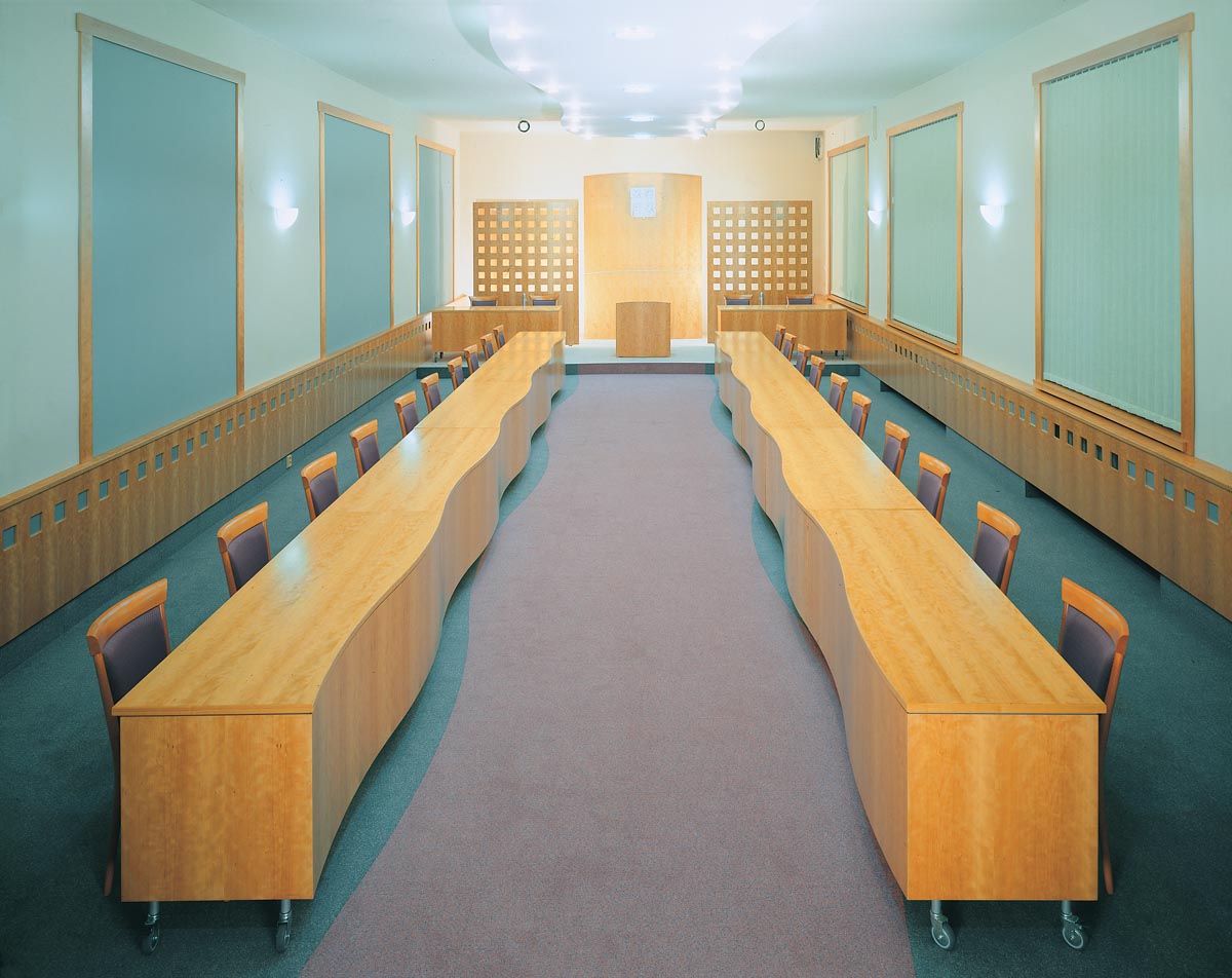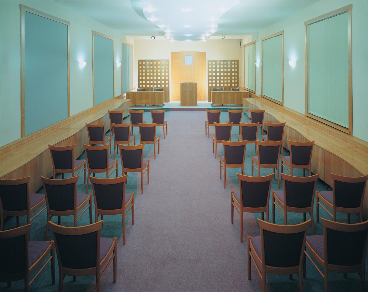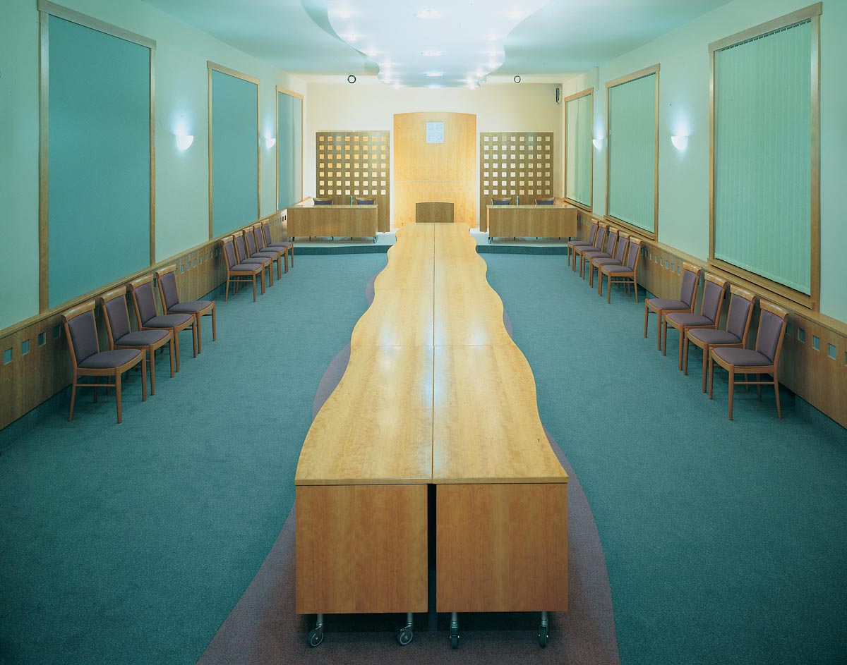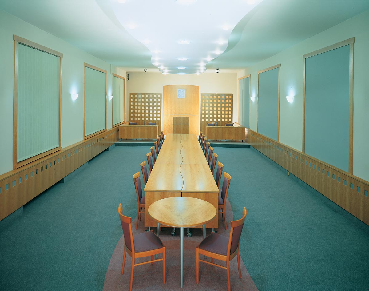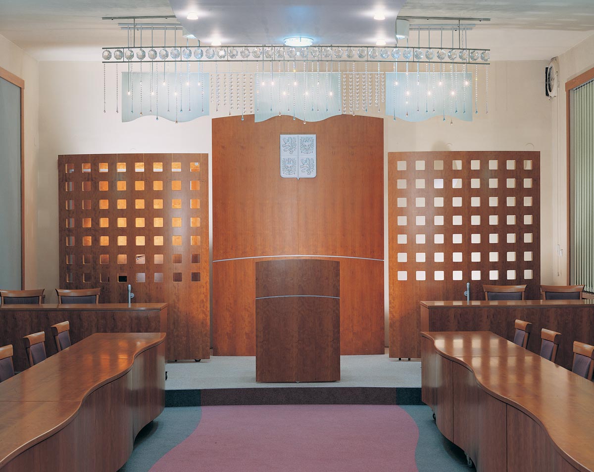 Návrh interiéru víceúčelové zasedací místnosti Městkého úřadu Boskovice. Místnost slouží jako obřadní síň, zasedací místnost a pro pořádání společenských akcí. Výroba: Cotto Lysice, 1997